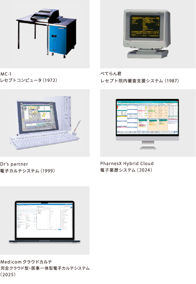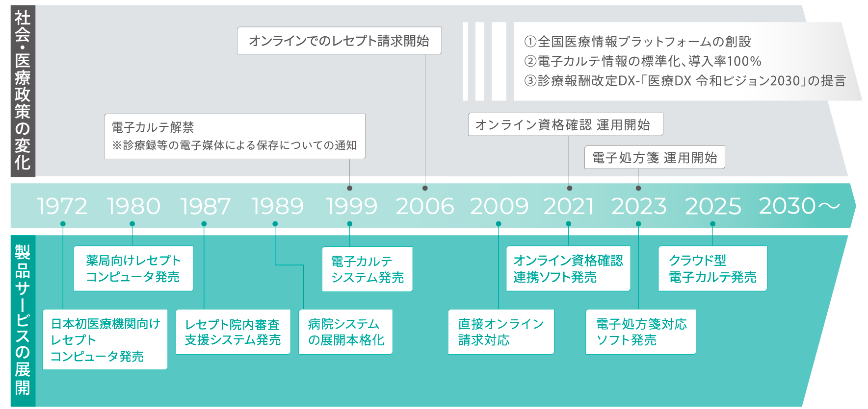 私たちは、医療業界のために尽くすという志のもとに日本初のレセプトコンピュータを発売して以来、医療にかかわる人々の業務を効率化し、より一人ひとりの価値を高めるための様々な「ヘルスケアソリューション事業」を提供しています。