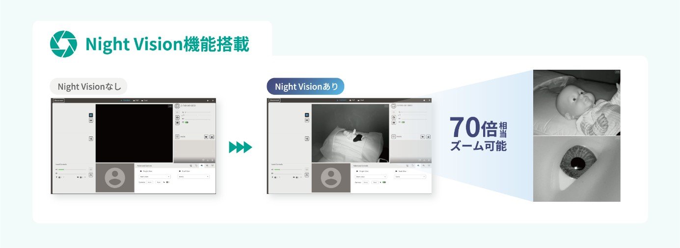 「TV Pro 300 Cart」は、高性能カメラとバッテリーを搭載しているため、電源や設置場所にとらわれず、さまざまな医療現場でご活用いただけます。ナイトビジョン機能により、暗い場所でもモニタリングができ、夜間のオンコール対応時にも、周囲に配慮した処置支援が行えます。