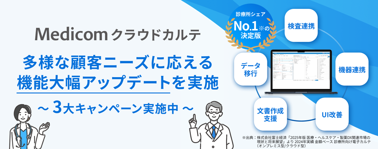 PHCホールディングス株式会社(本社:東京都千代田区)傘下のウィーメックス株式会社(本社:東京都渋谷区、代表取締役社長:高橋秀明、以下「ウィーメックス」)は、クリニック用レセコン一体型クラウドカルテ「Medicom クラウドカルテ」の機能アップデートを2025年10月に行いました。
