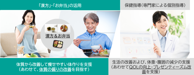 MYPLATE社の管理栄養士による食事・運動指導に加え、ウィメンズ漢方社の薬剤師がカウンセリングを行い対象者の症状にあった漢方をご提案し、体質の改善を促すプログラムです。漢方を併用することで、痩せやすい体質を作り、特定保健指導で取り組む「生活習慣の改善」がより良い結果につながりやすくなります。また、体質の偏りも改善することで、頭痛などの日々の不調の緩和を促し、QOL(生活の質)向上によるプレゼンティーズム(※2)の改善も期待できます。